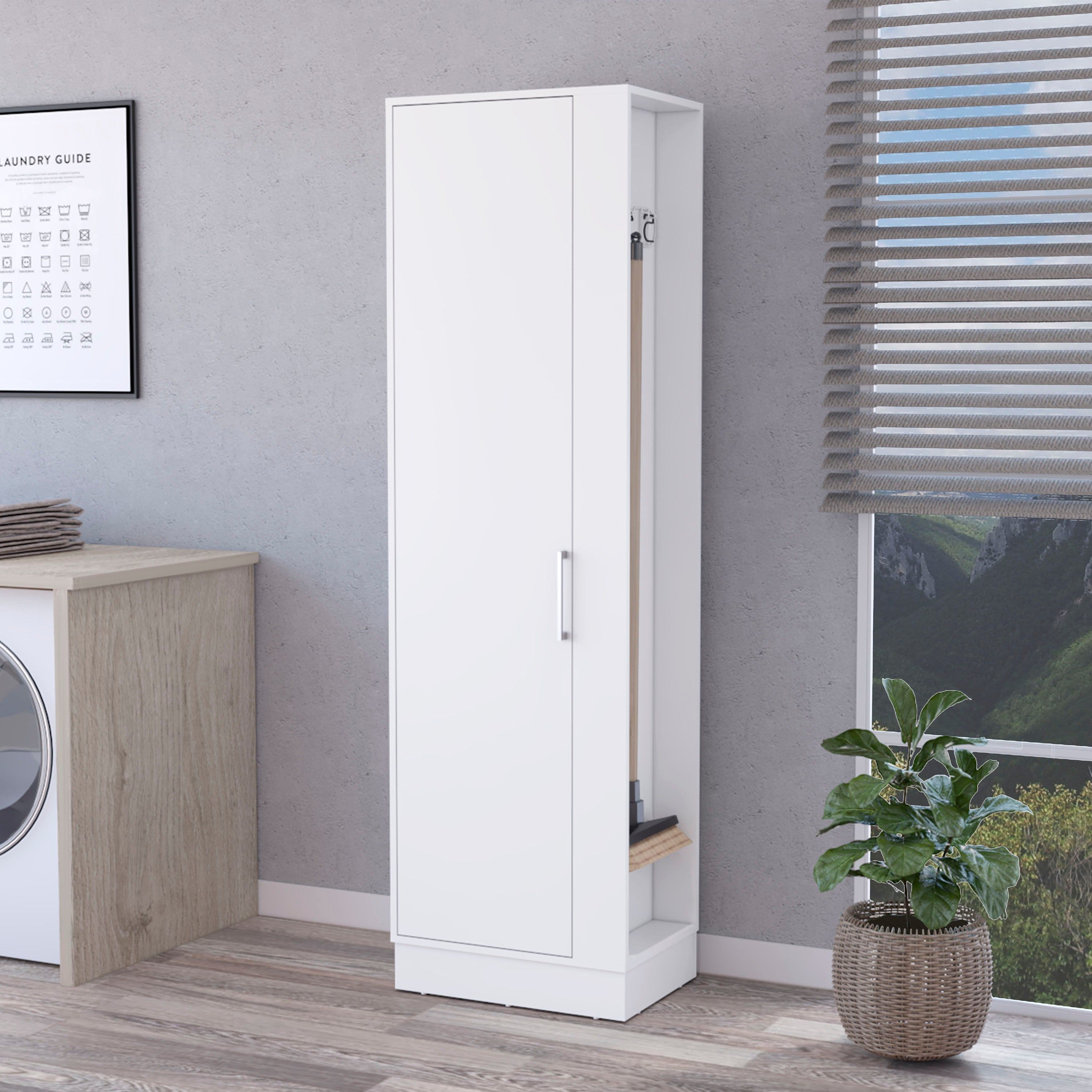 Introducing the Storage Cabinet, designed to provide all your storage needs in one place with its witty design and sturdy construction. Slim and adaptable, it features a wide door with a metal handle, six internal shelves for cleaning supplies, and three side broom hangers to keep brooms tidy.