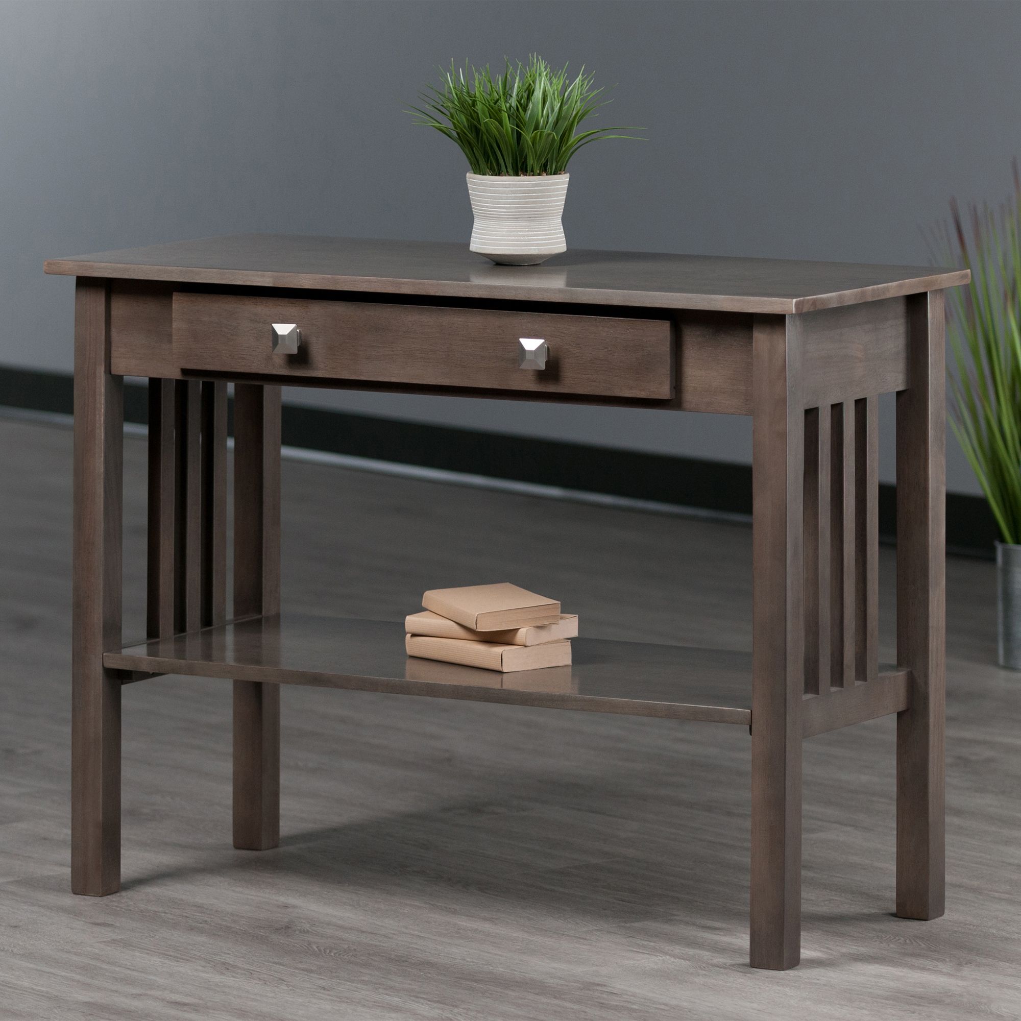 With clean line and contemporary oyster gray finish; the Winsome Wood Stafford Console Table makes a great complement to any decor. As an entryway table; it will welcome you home as a place to keep your keys and briefcase. Or use it in the dining room or living room to show off a lamp; favorite plant; or photos. The console's open shelf and unit-wide drawer offer a wealth of storage options. The mission-style slatted side panels combined with the console's straightforward; contemporary design allow for a seamless blend with any decor. Two beveled silver-finish drawer pulls provide the perfect accent. Coordinate this console table with other furnishings from the Winsome Stafford collection for a cohesive look throughout your home (each sold separately). Solid and composite wood construction for long-lasting integrity. Conveniently packed and shipped in 1 box; that includes the hardware necessary for assembling. Replacement part request can be submitted directly to the manufacturer within 60 days from date of purchase.