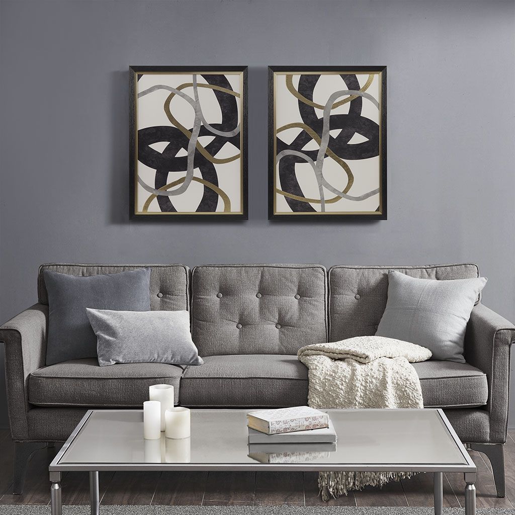 Add a bold artistic expression to your home with our Madison Park Moving Midas Gold Foil Abstract 2-piece Framed Canvas Wall Art Set by Artist 9 Lives Studio. Each framed canvas flaunts an abstract pattern in striking black, grey, and gold hues for a rich and modern look. The double moulding black frame adds beautiful dimension while the gold foiled detailing add a touch of glam for an elevated update. Two D-rings are finished on the reverse of each piece making this set easy to hang; simply hang together with any desired space as a larger focus wall decor or hang separately to add a modern touch to any room. Each piece measures 20.7x26.7" and is spot clean only.