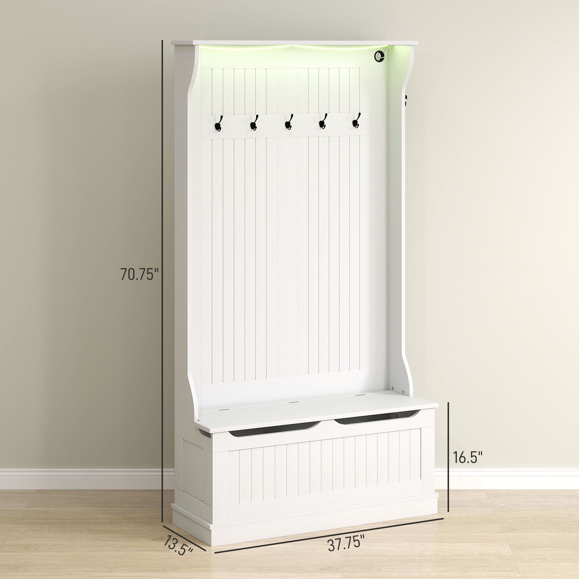 HOMCOM 3-In-1 Entryway Bench with LED Lights and Coat Rack, Hall Tree with Bench and Shoe Storage, 5 Hooks for Hallway White