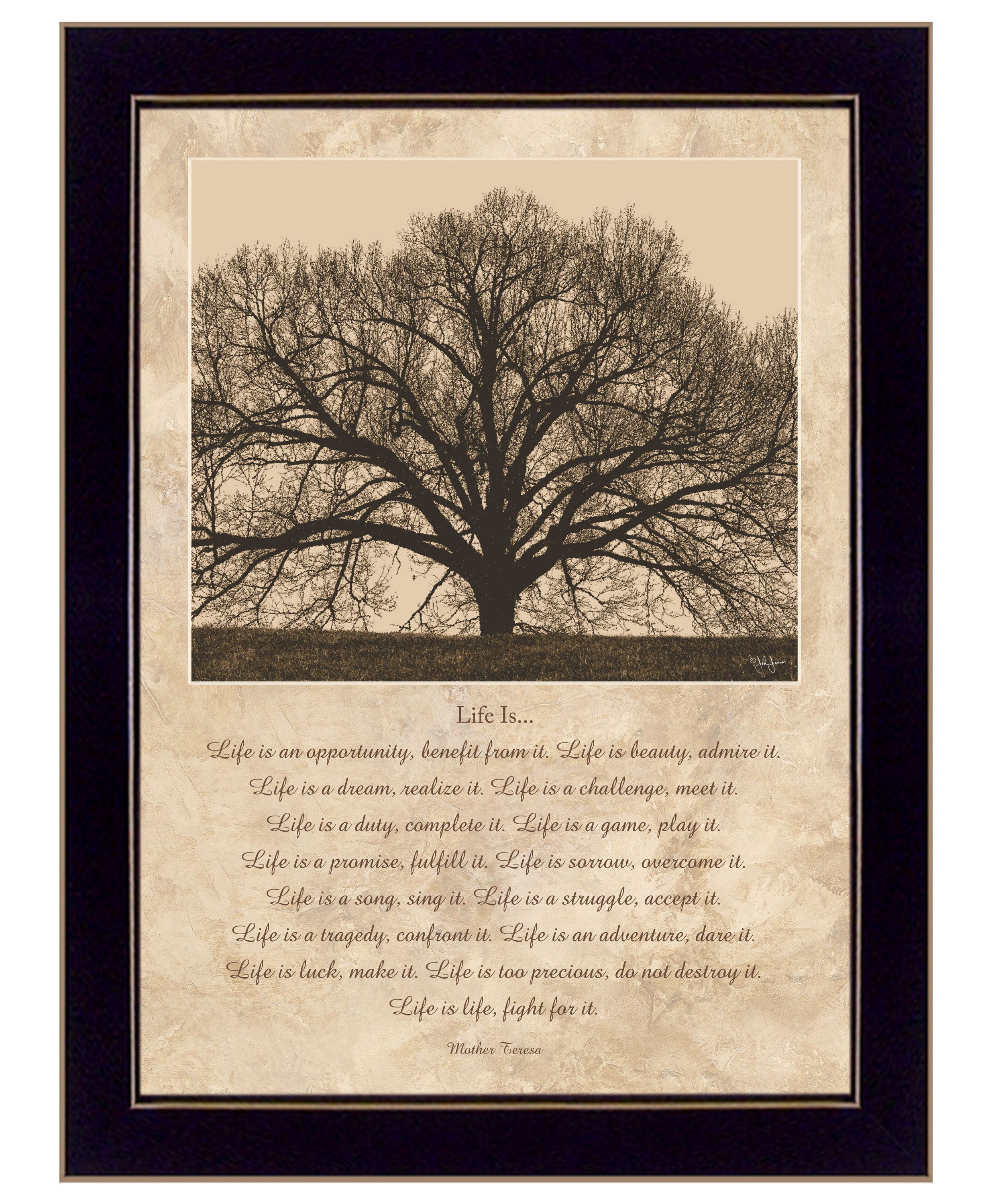 "Life Is" is a 14"x18" black framed inspirational framed art print by artist John Jones. This artwork features a prominent image of a Grand Tree on the top half of the presentation. The bottom portion of the piece presents a verse entitled "Life Is" by the exceptional Mother Theresa. Crafted By Skilled American Crafters And Coated With A Fade-resistant Texture, This Piece Has A Canvas-like Appearance That Will Last For Years To Come. Invest In A Piece That Is Truly One-of-a-kind.•Transform your walls with this stunning piece of art and bring a touch of modern elegance to your room. This stunning piece will not only add visual interest to any room but it's minimalist design will bring a sense of serenity to your space.•Tired of dull, empty walls in your home? We believe that walls should inspire, not bore. That's why we offer a wide range of wall art to suit any space from bedroom and kitchens to office and beyond. Give your walls a facelift with our printed arts and transform your space into a stylish and inviting home.•This framed wall art is hand-crafted in the USA of high-quality wood with the surface of the art coated with a fade-resistant texture which gives it a canvas-like appearance for many years of enjoyment in your home.•Bring a pop of colour and style to any room with our fully assembled and ready-to-hang wall art. With a wide selection of decorative pieces to choose from, you'll easily find the perfect match for your personal taste or to give as a thoughtful gift. Don't miss out on the opportunity to add some unique charm to your space.•Experience the unmatched quality and durability of American-made craftsmanship with this individually hand-crafted wall decoration art. Skilled crafters put their expertise into every piece to ensure it will stand test of time and bless your eyes for years to come.