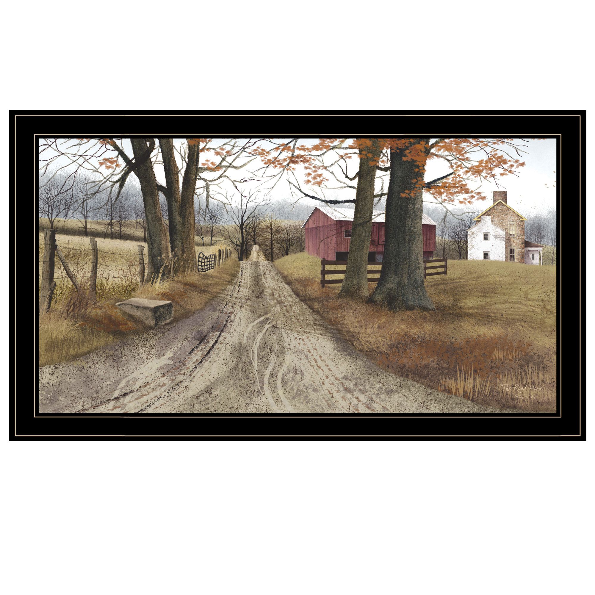 "The Road Home" by artisan Billy Jacobs. This 33x19 Black framed print of a road leading to a homestead. A country dirt road in the fall leads to a barn and farmhouse. This totally American Made wall decor item features an decorative black frame. The framed art print has a protective, archival finish (glass is not needed) and arrives ready to hang. Crafted By Skilled American Crafters And Coated With A Fade-resistant Texture, This Piece Has A Canvas-like Appearance That Will Last For Years To Come. Invest In A Piece That Is Truly One-of-a-kind.•Transform your walls with this stunning piece of art and bring a touch of modern elegance to your room. This stunning piece will not only add visual interest to any room but it's minimalist design will bring a sense of serenity to your space.•Tired of dull, empty walls in your home? We believe that walls should inspire, not bore. That's why we offer a wide range of wall art to suit any space from bedroom and kitchens to office and beyond. Give your walls a facelift with our printed arts and transform your space into a stylish and inviting home.•This framed wall art is hand-crafted in the USA of high-quality wood with the surface of the art coated with a fade-resistant texture which gives it a canvas-like appearance for many years of enjoyment in your home.•Bring a pop of colour and style to any room with our fully assembled and ready-to-hang wall art. With a wide selection of decorative pieces to choose from, you'll easily find the perfect match for your personal taste or to give as a thoughtful gift. Don't miss out on the opportunity to add some unique charm to your space.•Experience the unmatched quality and durability of American-made craftsmanship with this individually hand-crafted wall decoration art. Skilled crafters put their expertise into every piece to ensure it will stand test of time and bless your eyes for years to come.